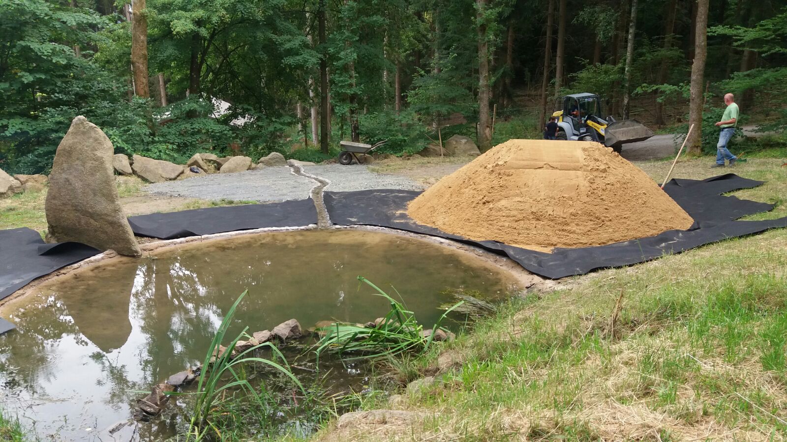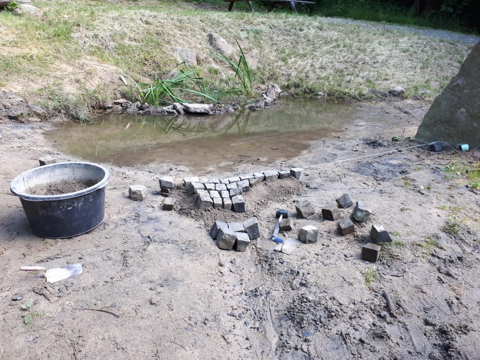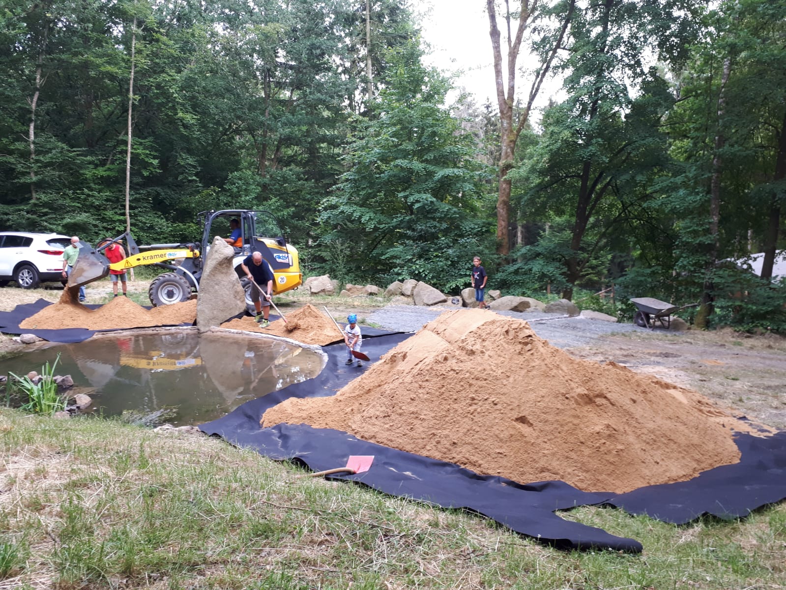 Jetzt sah es schon deutlich besser aus. Doch das reicht uns noch nicht: Eine Einfassung aus Pflastersteinen und eine schöne Rinne geben dem Ganzen nun halt und eine schöne Optik. Damit unsere kleinen (und auch teilweise großen Besucher) ordentlich was zum Bauen haben, haben wir um das Biotop einen gigantischen Sandkasten eingerichtet. Hier kann nach Herzens Lust gebuddelt werden