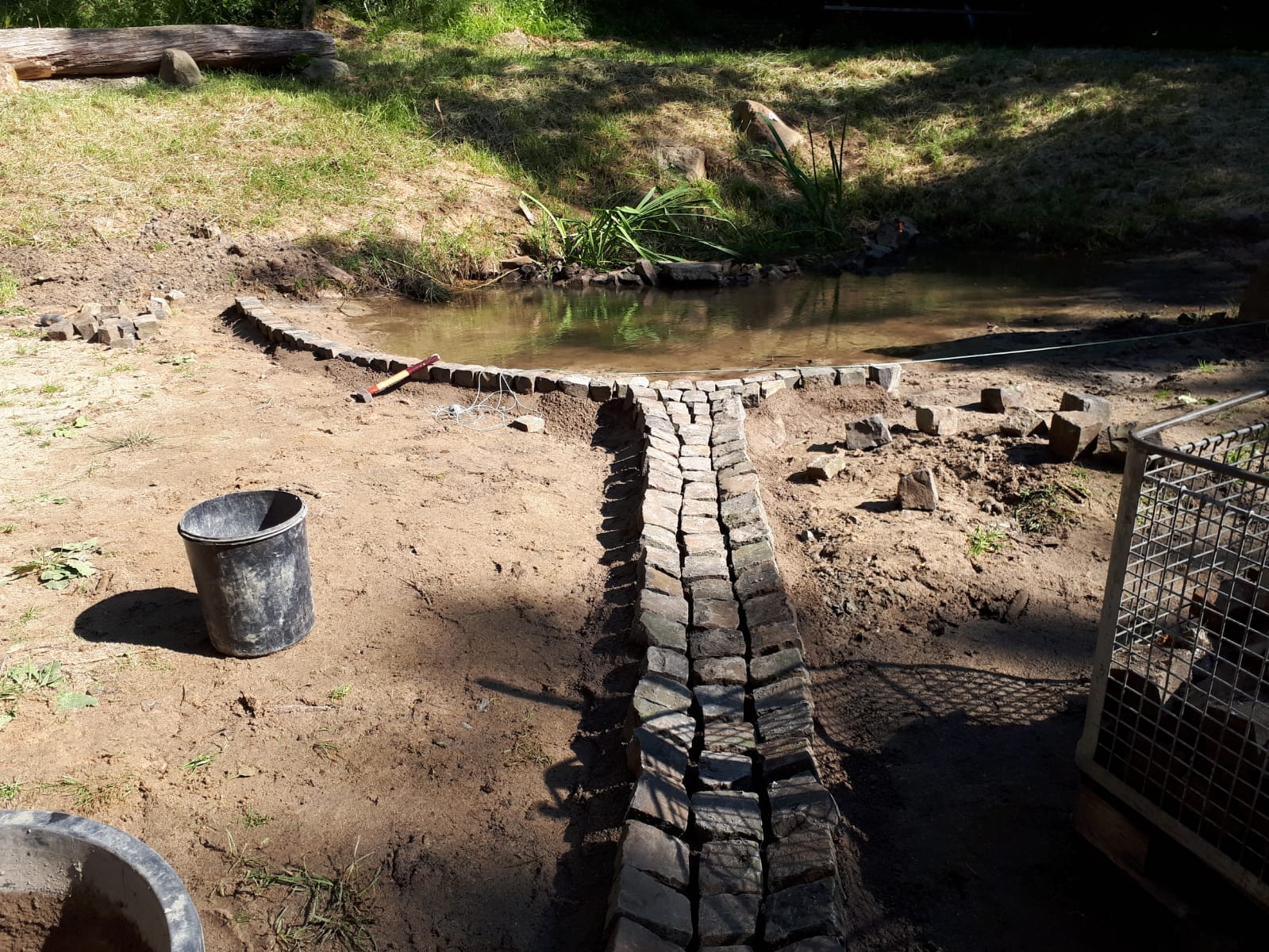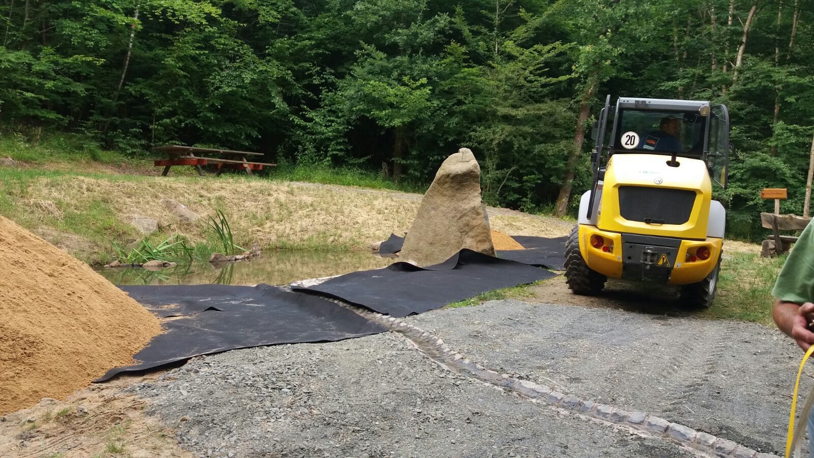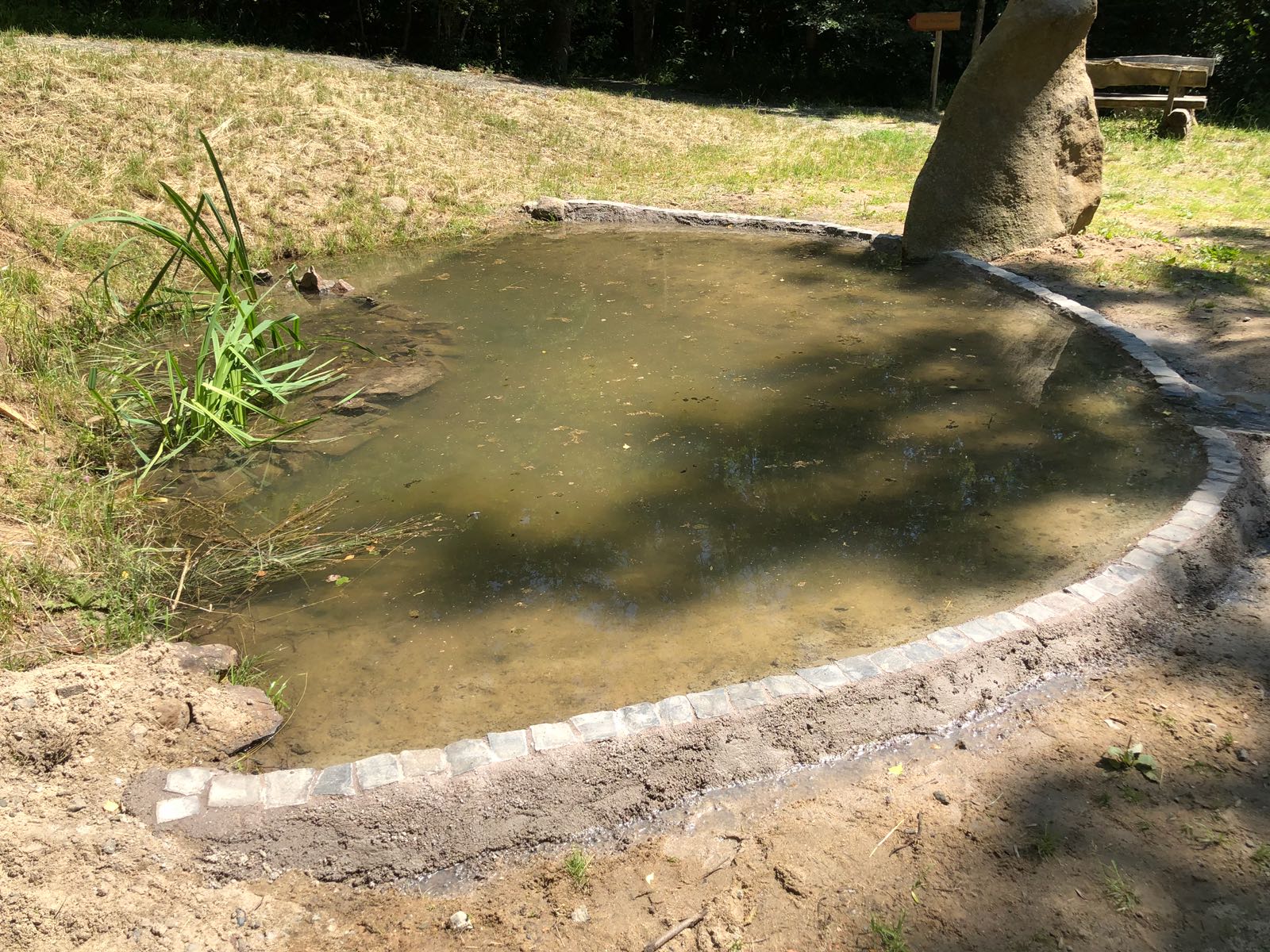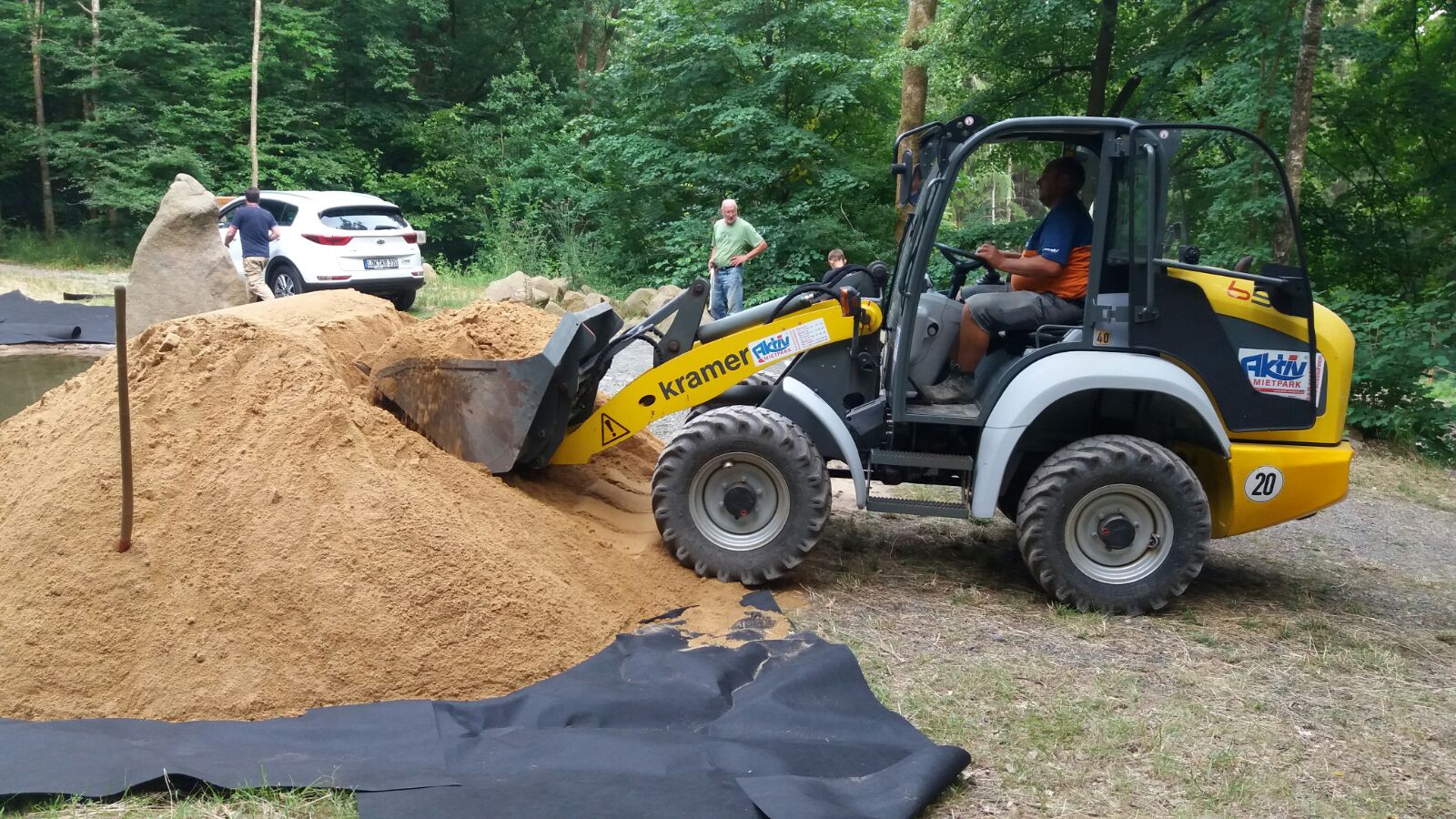 Jetzt sah es schon deutlich besser aus. Doch das reicht uns noch nicht: Eine Einfassung aus Pflastersteinen und eine schöne Rinne geben dem Ganzen nun halt und eine schöne Optik. Damit unsere kleinen (und auch teilweise großen Besucher) ordentlich was zum Bauen haben, haben wir um das Biotop einen gigantischen Sandkasten eingerichtet. Hier kann nach Herzens Lust gebuddelt werden