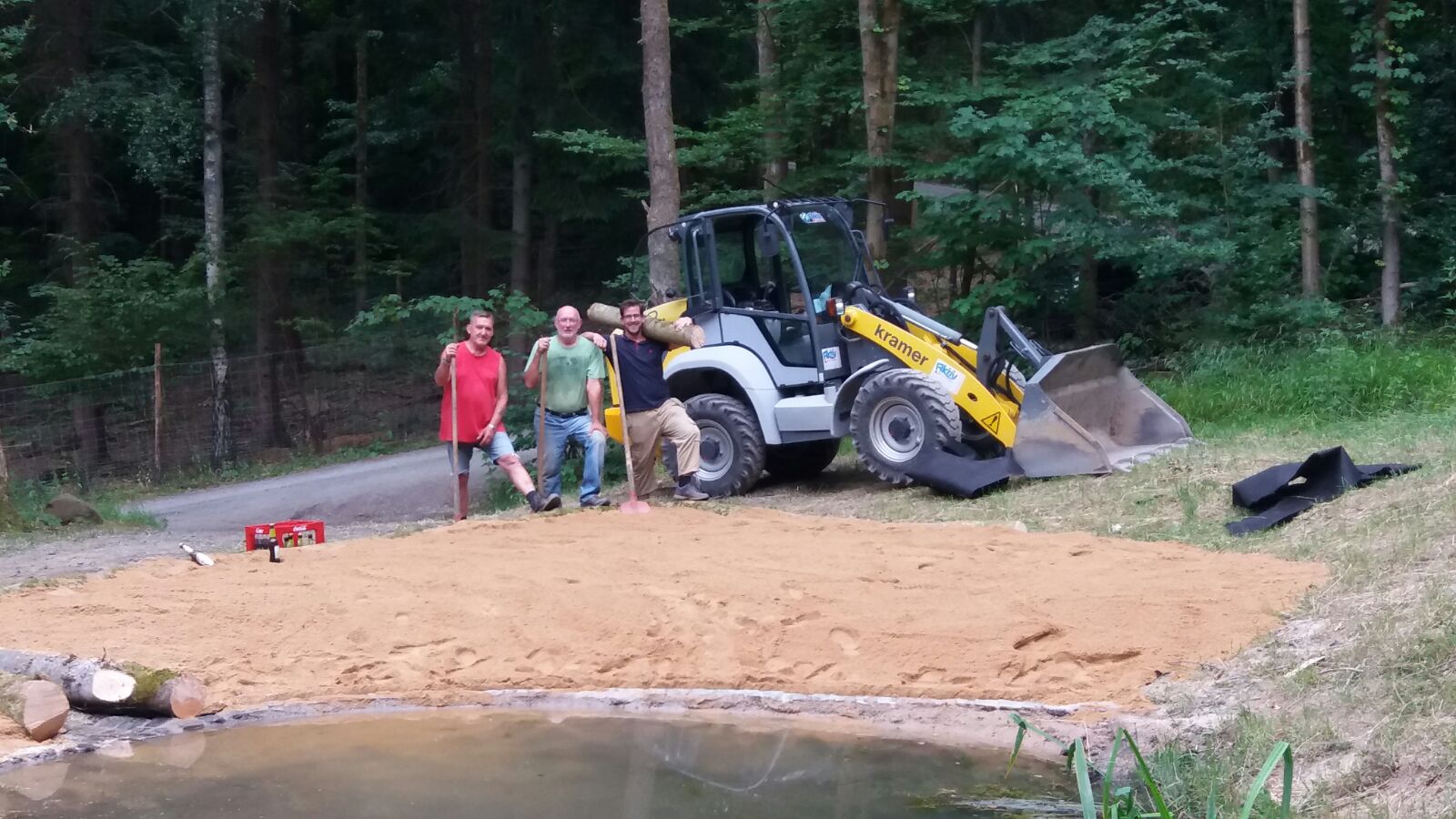 Zuerst haben wir die Bewohner des Biotops in Sicherheit gebracht. Danach ging es dem Schlamm an den Kragen: Mit Schubkarre und Schaufel wurde alles entfernt.
