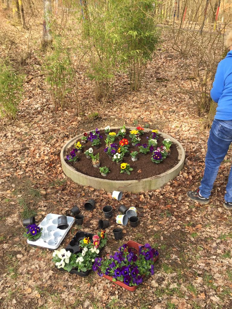 Innerhalb kürzester Zeit war das Loch verfüllt, und eine Schicht Mutterboden aufgetragen. Die Blumen hat uns die Friedhofsverwaltung zur Verfügung gestellt. Und unser Mitglied Kerstin nahm sich die nötige Zeit zum pflanzen